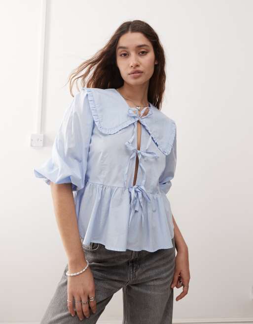 Monki – Ljusblå långärmad blus i peplum-modell med volang och krage
