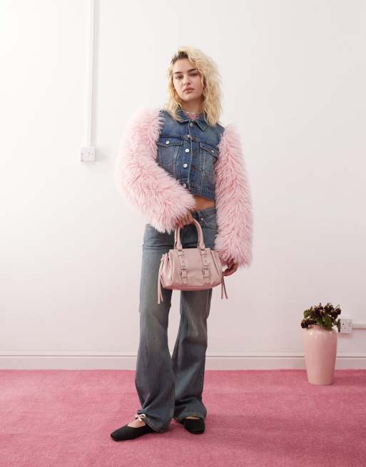 Monki – Mellanblå jeansjacka med rosa fuskpälsärmar