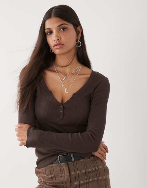 Monki – Mörkbrun topp med långa, utsvängda ärmar och henley-knäppning