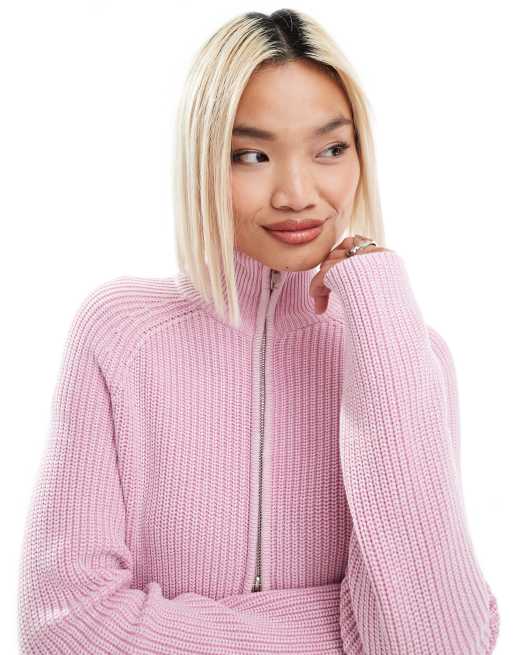 Monki – Rosa, stentvättad, ribbstickad kofta med tvåvägsdragkedja