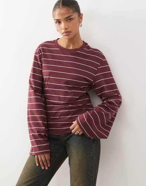 Monki – Vinröd och rosarandig topp i strukturerad jersey med markerad midja och långa ärmar