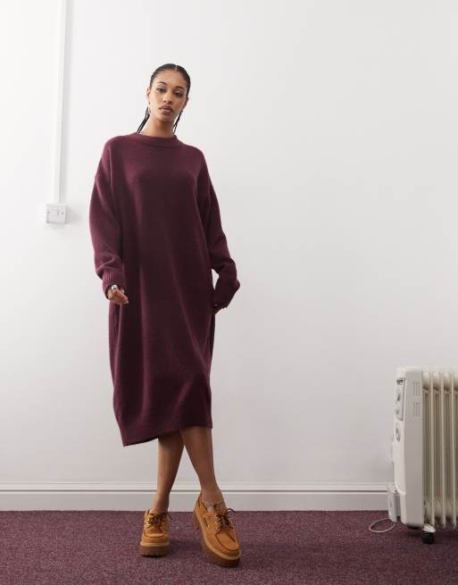 Monki – Vinröd, stickad midiklänning med långa ärmar