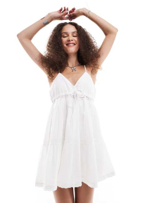 Monki – Vit, strukturerad, panelsydd miniklänning med spetsdetaljer