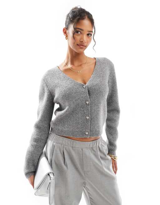 Morgan – Grå kofta med v-ringning och utsmyckade hjärtknappar