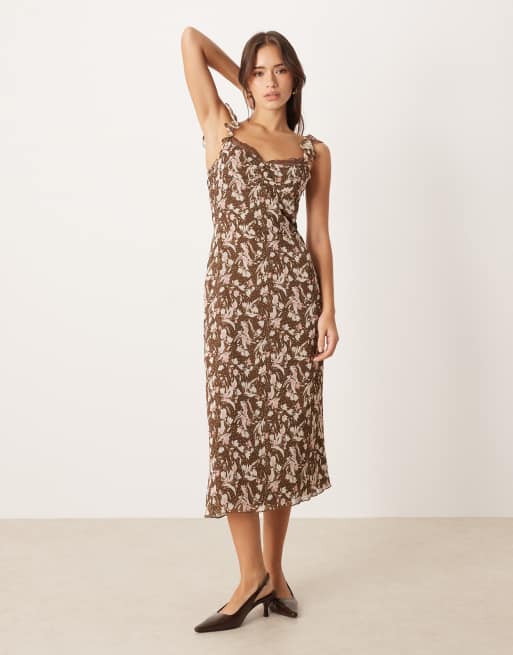 Motel – Daita – Brun, blommig midiklänning med spetskant och volangärmar
