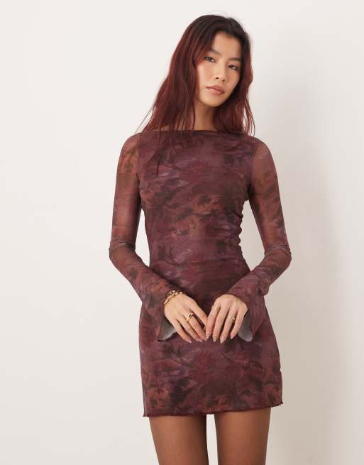 Motel – Sevila – Vinröd miniklänning med långa ärmar och suddigt, blommönster