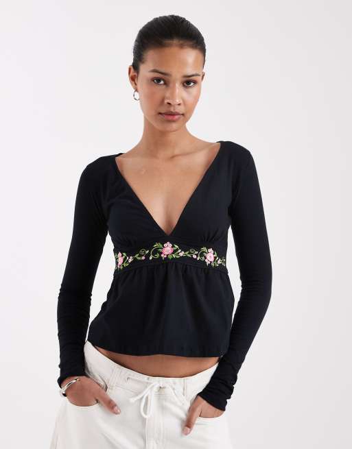 Motel – Yahop – Svart, blommig topp med långa ärmar och djup urringning