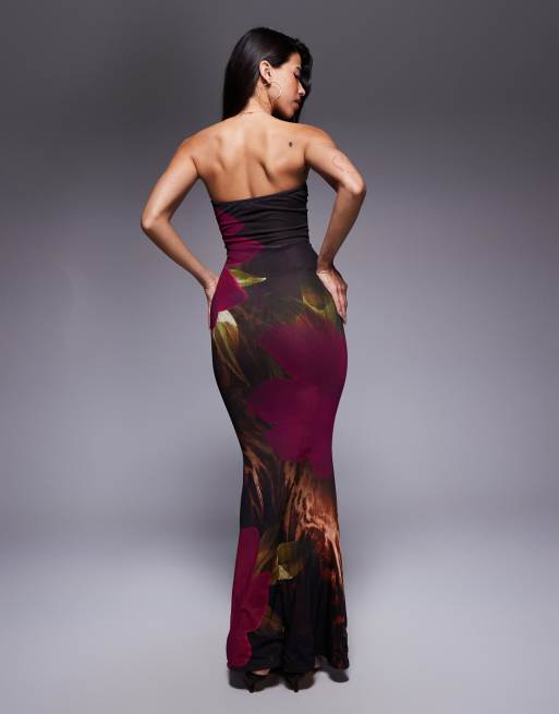 Murci – Exklusivt – Lila, blommig maxiklänning i mesh med bandeau-ringning och fishtail-design