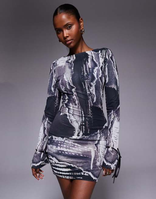 Murci – Svart och grå miniklänning i mesh och läderimitation med båtringning, knytband vid ärmsluten och abstrakt mönster
