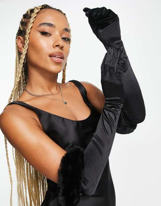 My Accessories London – Svarta armbågslånga handskar med fuskpäls
