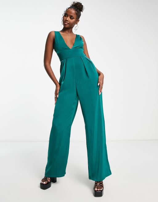 NaaNaa – Smaragdgrön jumpsuit i satin med djup ringning