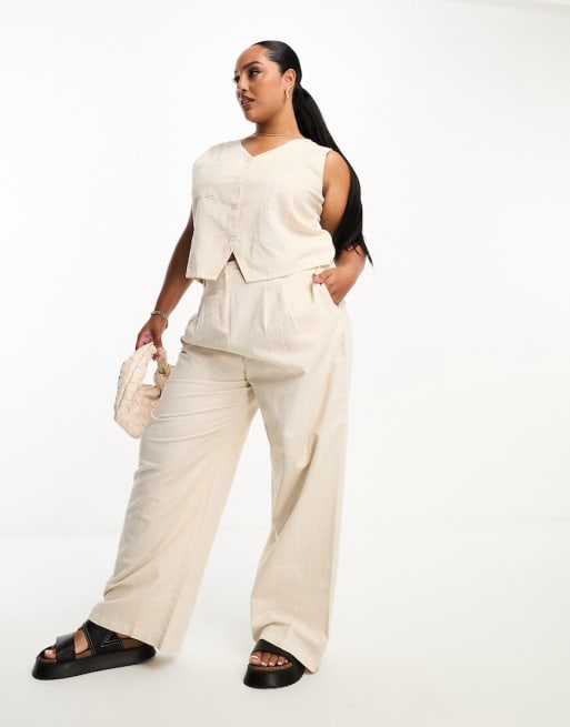 Native Youth – Plusstorlek – Naturfärgat, avslappnat linneset med kostymväst och vida byxor