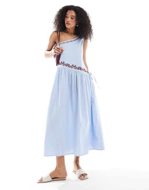 Native Youth – Havsblå, enaxlad midaxiklänning i linne med broderi