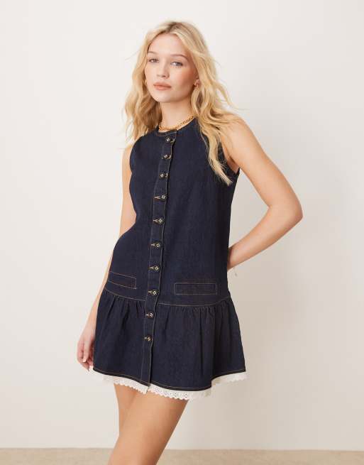 Neon Rose – Indigoblå förklädesklänning i denim med knappar framtill