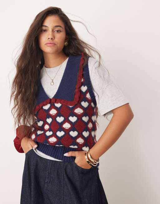 Neon Rose – Marinblå, stickad väst i harlequinstil med argylemönster