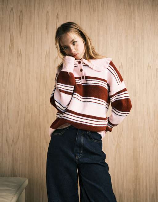 Neon Rose – Vinröd och rosa, randig pikétröja med stor krage