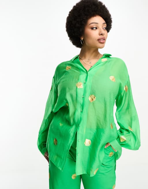 Never Fully Dressed Plus – Grön skjorta i oversize och metalliskt snäckmönster, del av set