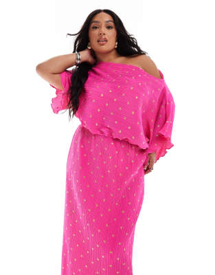 Never Fully Dressed Plus – Tilly – Rosa, plisserad maxiklänning med guldfärgat mönster