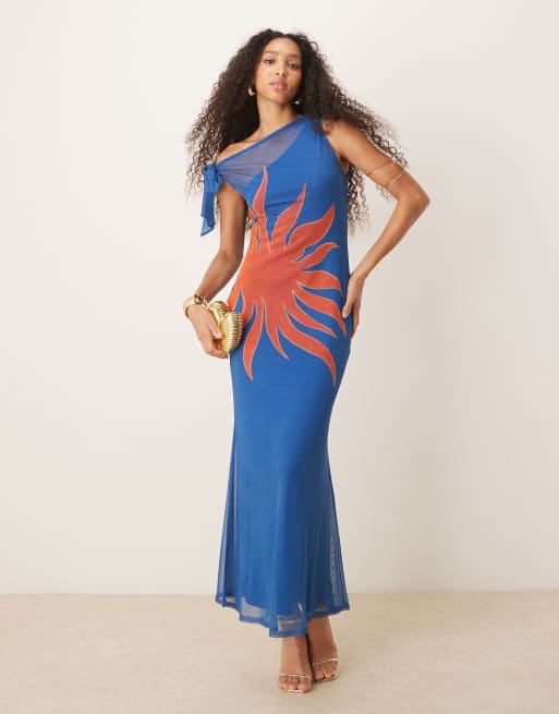 Never Fully Dressed – Blå, asymmetrisk maxiklänning med bara axlar och soltryck