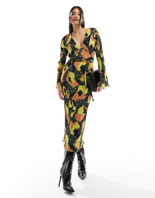 Never Fully Dressed – Kakimönstrad, plisserad maxiklänning med kimonoärm och guldiga fläckar