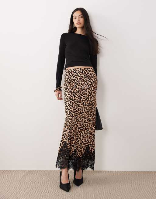 Never Fully Dressed – Leopardmönstrad midikjol i satin med spetskantad fåll