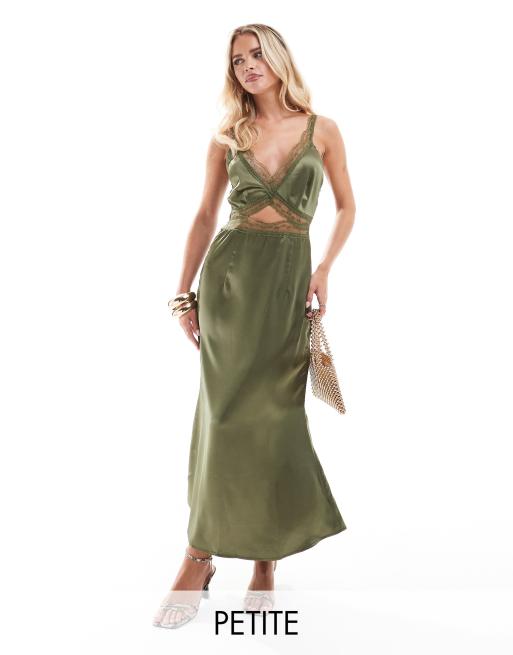Never Fully Dressed Petite – Olivgrön midaxi-slipklänning i spets med utskurna detaljer