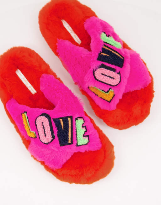 Never Fully Dressed – Rosa fluffiga innetofflor med LOVE-text