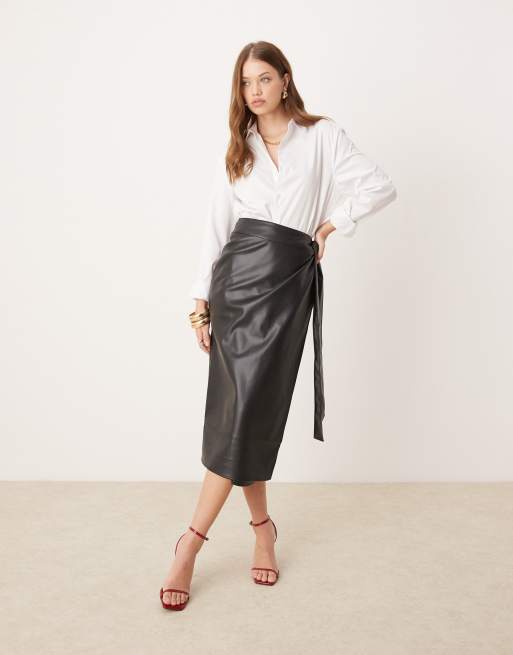 Never Fully Dressed – Svart midi-kjol i PU och omlottdesign