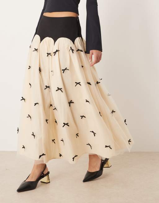 Never Fully Dressed – Svart och krämvit maxikjol med lång fåll och kontrastfärgade rosetter