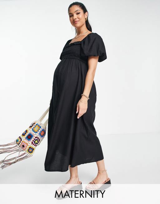 New Look Maternity – Svart smockad midiklänning med puffärmar