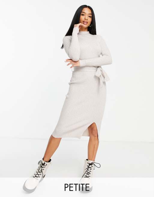 New Look Petite – Havrefärgad, ribbad midiklänning med knytning i midjan