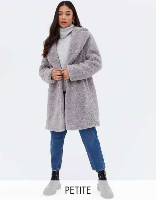 New Look Petite – Ljusgrå kappa i teddy med midilängd