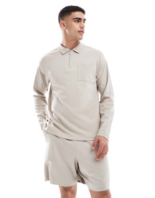 New Look – Beige pikétröja med långa ärmar och dragkedja, del av set