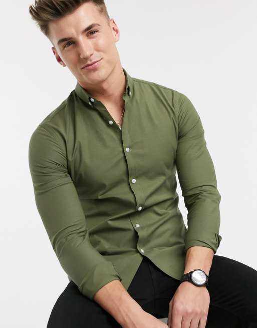 New Look – Kakigrön, fin oxfordskjorta i muscle fit med långa ärmar