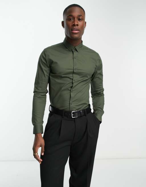 New Look – Khakifärgad poplinskjorta i muscle fit med lång ärm
