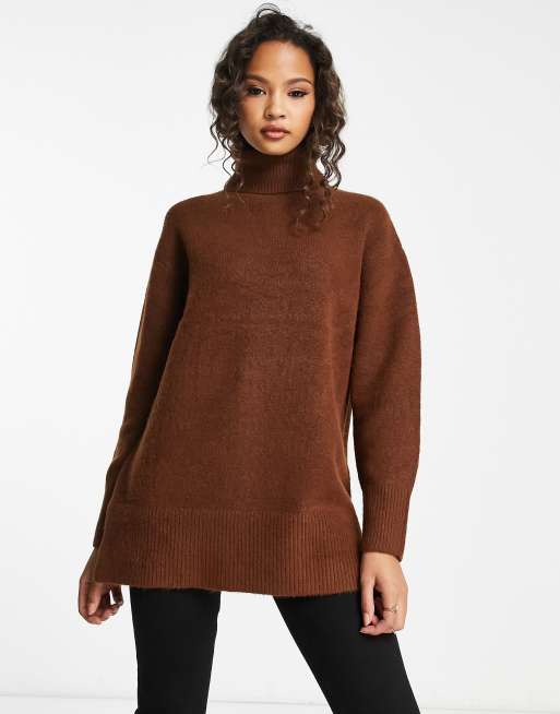 New Look – Roströd stickad tröja med bred fåll och polokrage