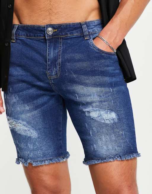Night Addict – Indigoblå jeansshorts med råskuren fåll