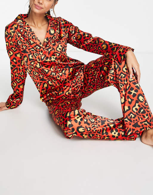 Night – Röd, leopardmönstrad, lång, pyjamas av satin