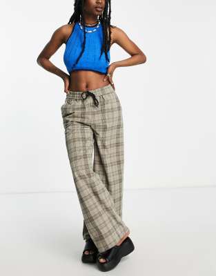 Noisy May – Brunrutiga byxor i dad-modell med vida ben och medelhög midja