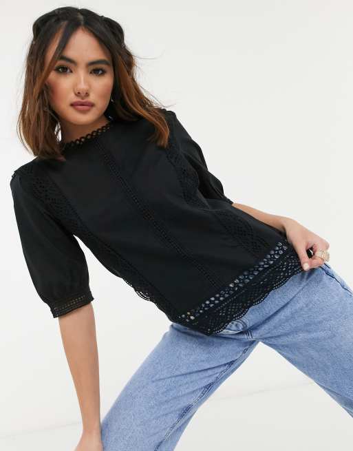 Oasis – Svart poplin-topp spetskant