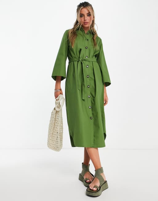 Object – Grön skjortklänning i midilängd med knytning i midjan och stora ärmar