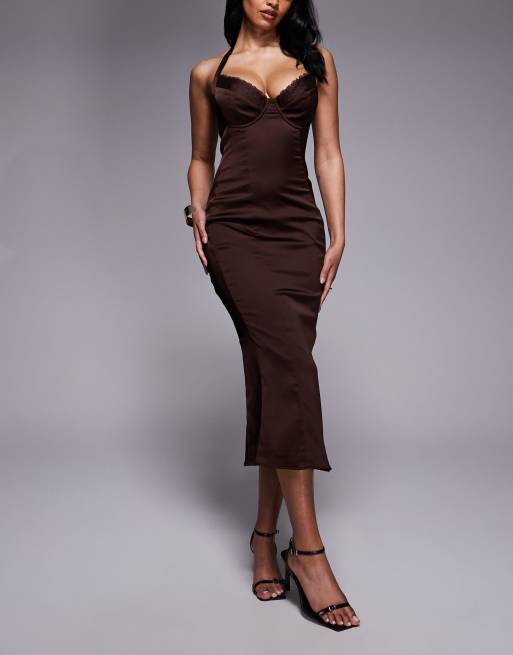 Oh Polly – Fylligare byst – Chokladbrun midaxiklänning i satin med bygel och halterneck