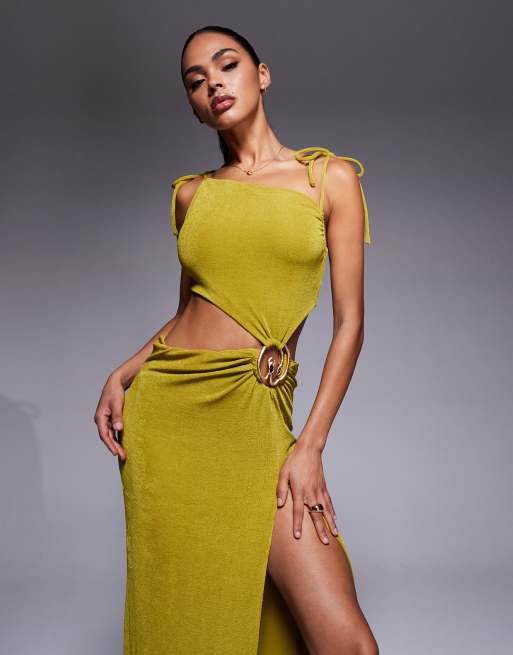 Oh Polly – Olivgrön maxiklänning i texturerad jersey med draperad ringning och utskurna detaljer