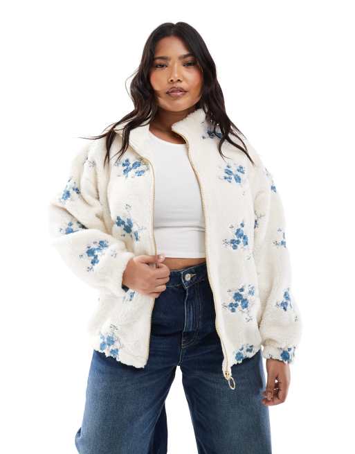 ONLY Curve – Gräddvit, broderad jacka i teddy med dragkedja