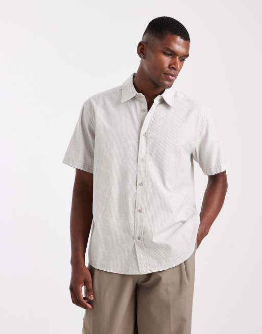 Only & Sons – Vit, kortärmad skjorta med ljusbruna, randiga ränder