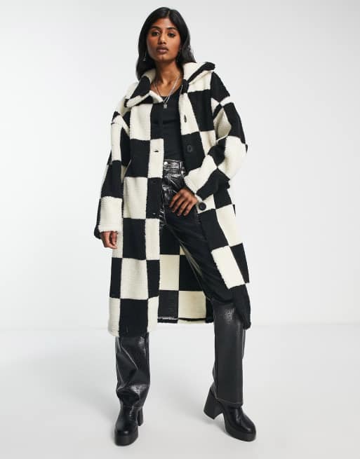 Neon & Nylon – Svartvit schackrutig teddykappa i lång modell