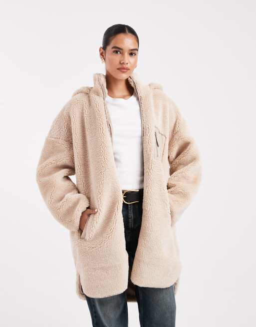 ONLY – Beige jacka i teddy med huva