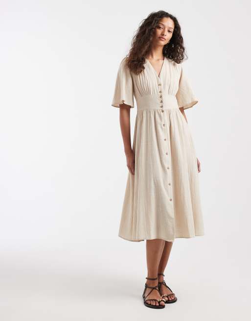 ONLY – Beige skjortklänning i midilängd och linnelook