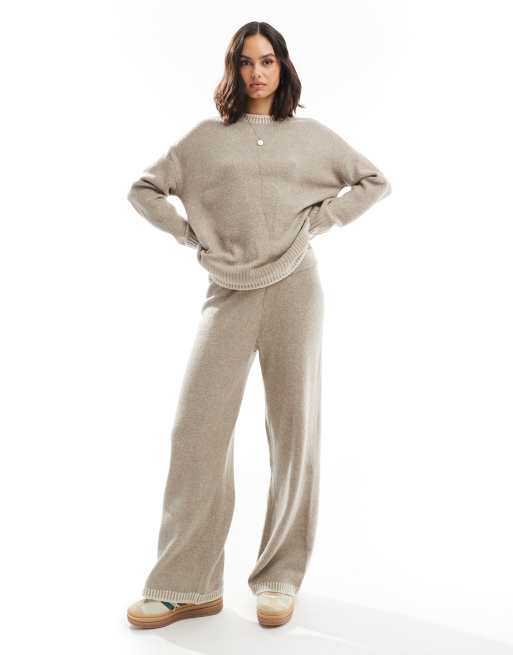 ONLY – Beige, stickade byxor med vida ben och sömdetalj vid fållen, del av set