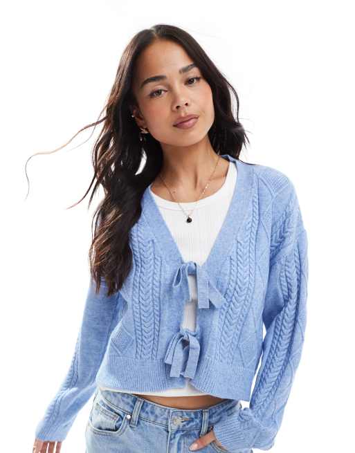 ONLY – Blå, stickad kofta med knytning framtill